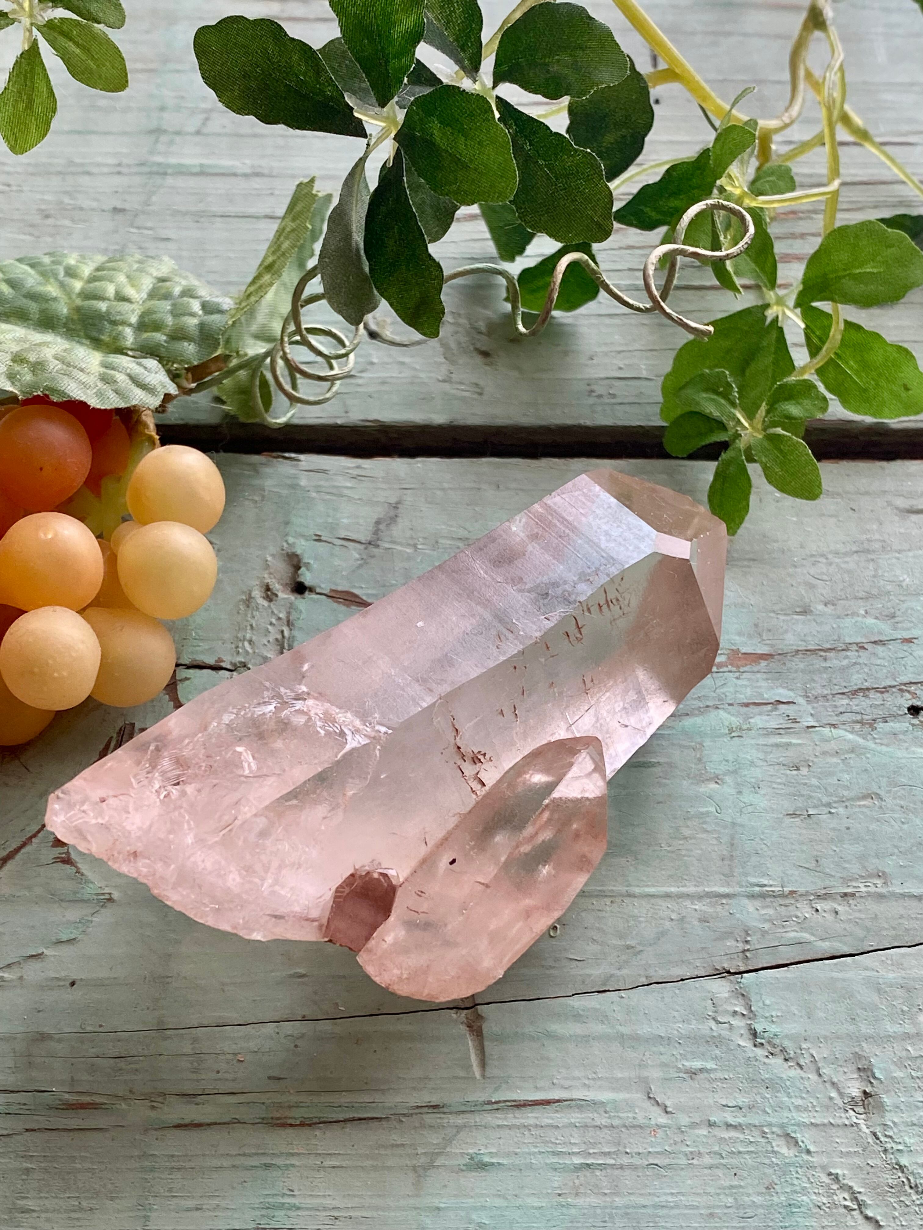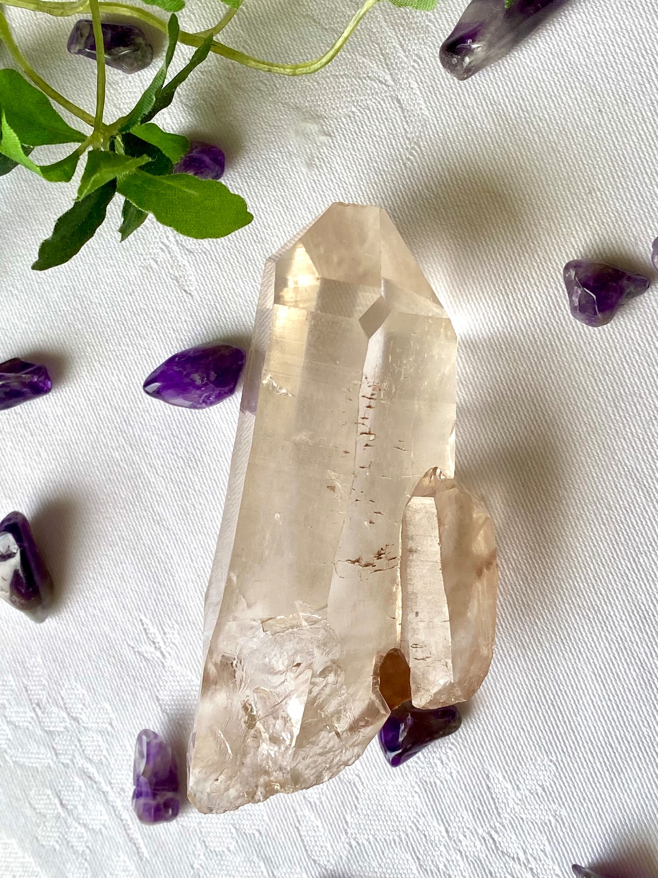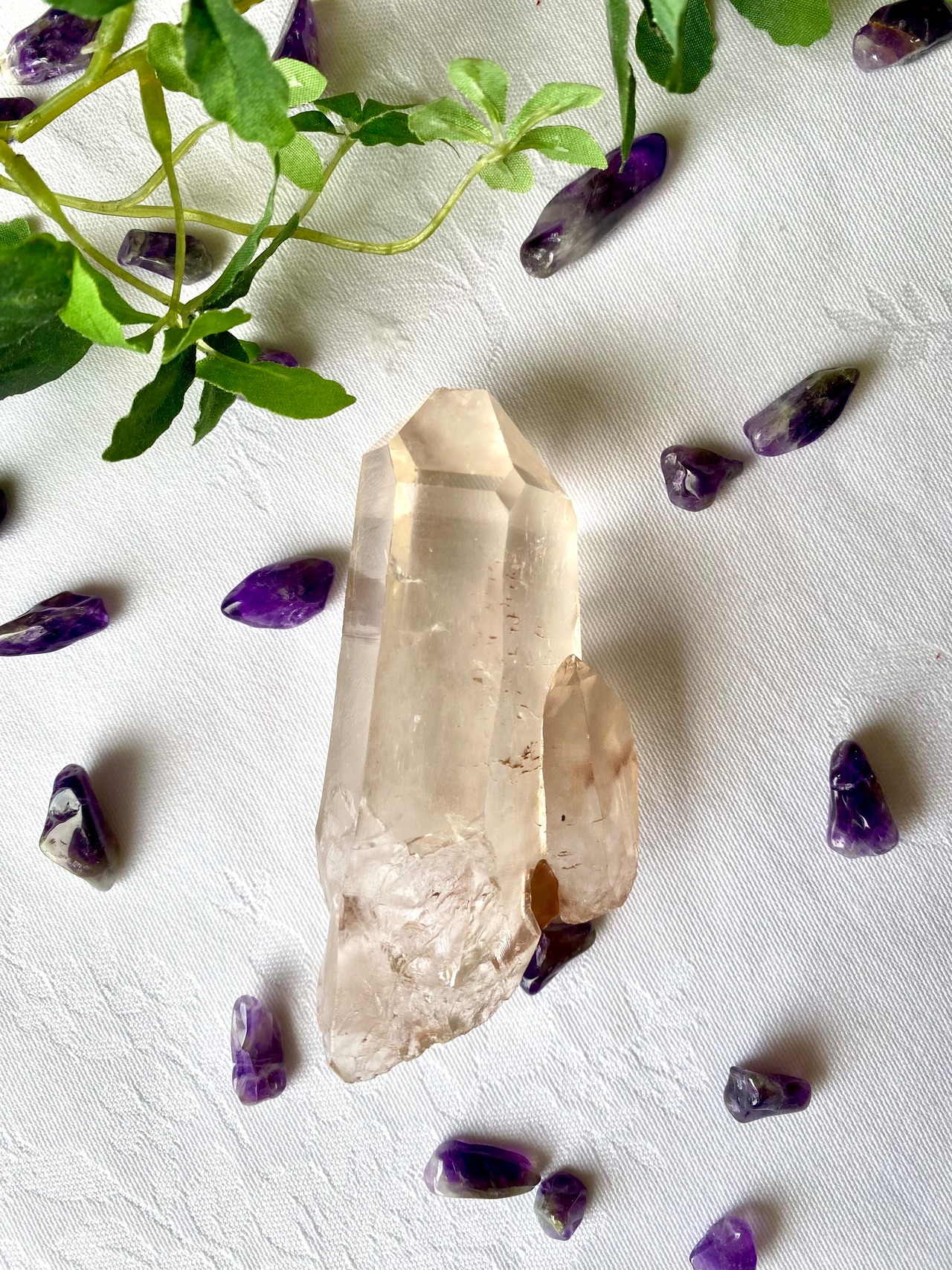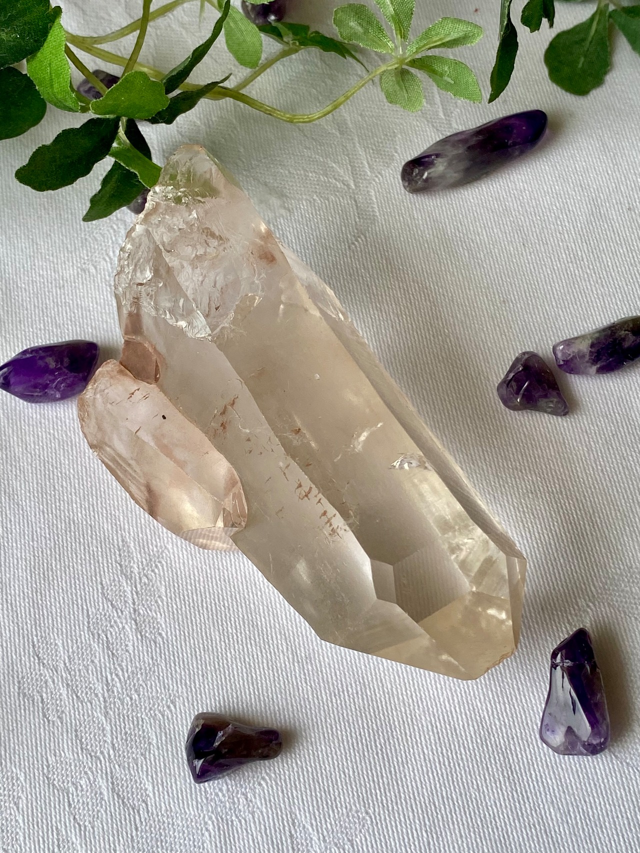 ポイントにそっと寄り添う小さなクォーツを伴うこの水晶は家族愛や夫婦愛を深めてくれるでしょう。